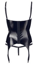 Ultra-erotyczny, błyszczący wygląd! Haleczka z podwiązkami bez biustu marki Black Level wraz ze stringami w całości wykonana z czarnego, patentowego połysku.