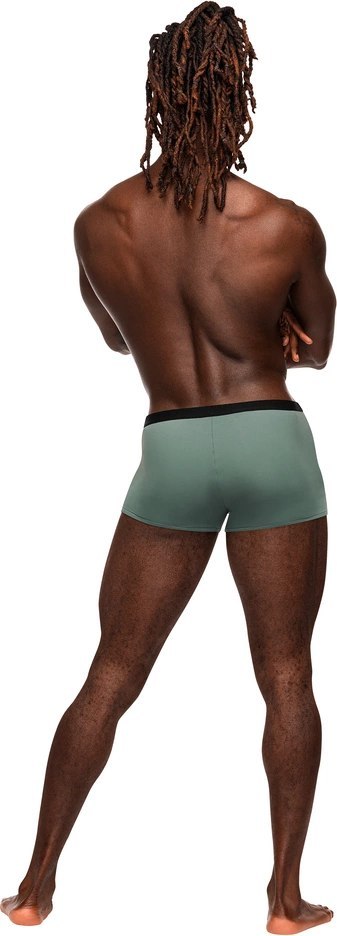 Z kolekcji Male Power Magnificence ten styl obejmuje mini szorty z wyciętym okienkiem w talii, ozdobnymi metalowymi przelotkami i wąskim, pluszowym elastycznym pasem.