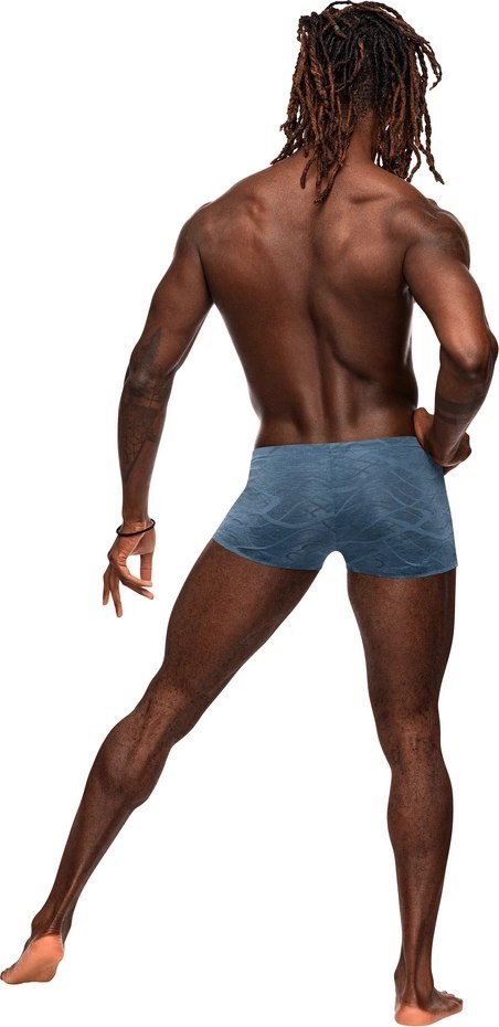 Z kolekcji Male Power Inter-mingle ten styl obejmuje mini szorty z niskim wycięciem w talii, wysoko wyciętymi nogawkami, workiem konturowym i pełnym zakryciem z tyłu.