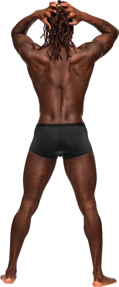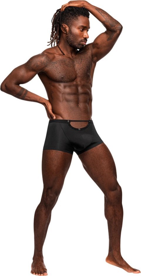 Z kolekcji Male Power Magnificence ten styl obejmuje mini szorty z wyciętym okienkiem w talii, ozdobnymi metalowymi przelotkami i wąskim, pluszowym elastycznym pasem.